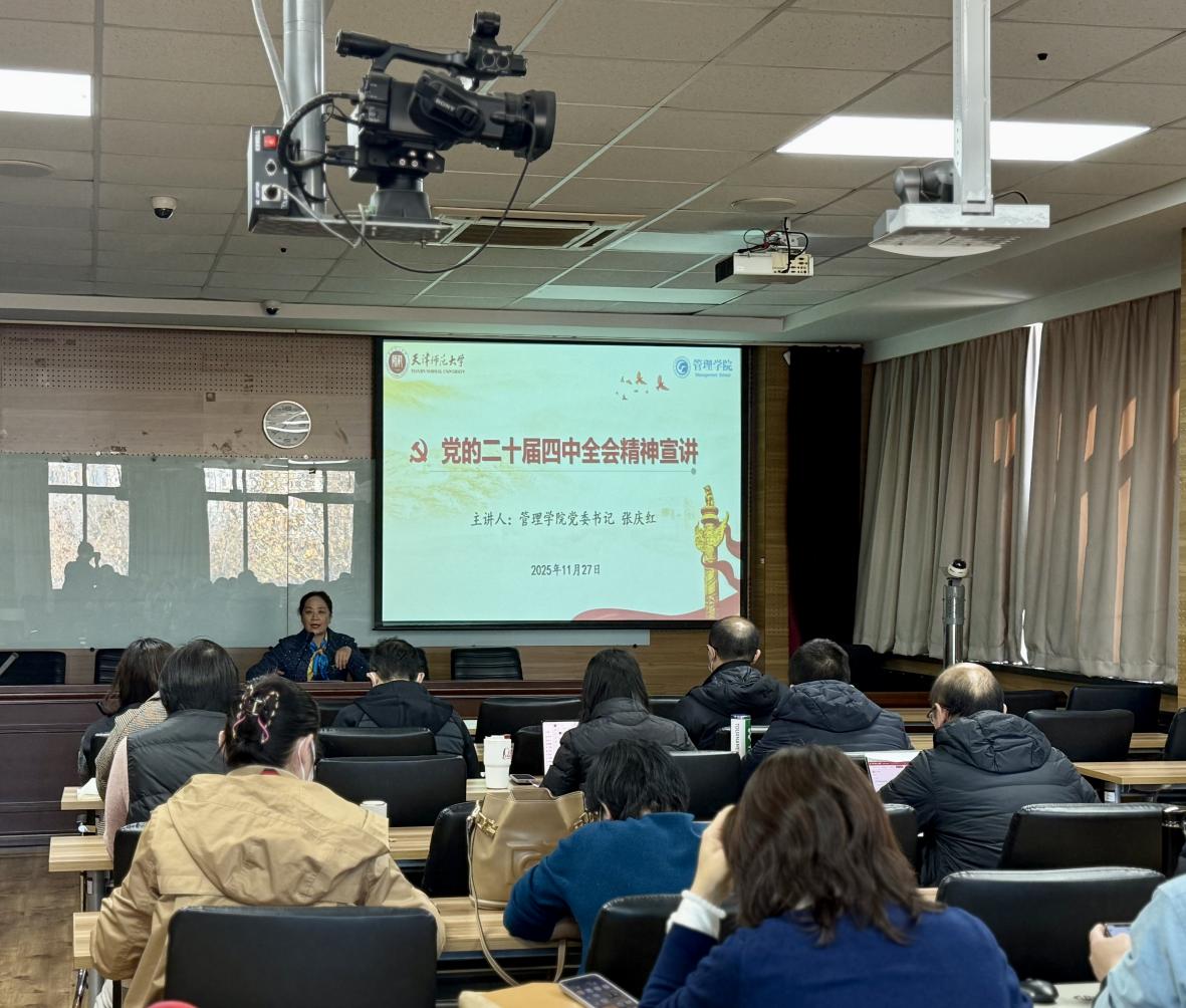 为深入学习贯彻党的二十届四中全会精神,切实将全院教师的思想和行动统一到全会精神上来,把智慧和力量凝聚到落实全会确定的目标任务上来,11月27日,管理学院召开党的二十届四中全会精神宣讲会,党委书记张庆红作专题讲解,学院80余名教师参会。