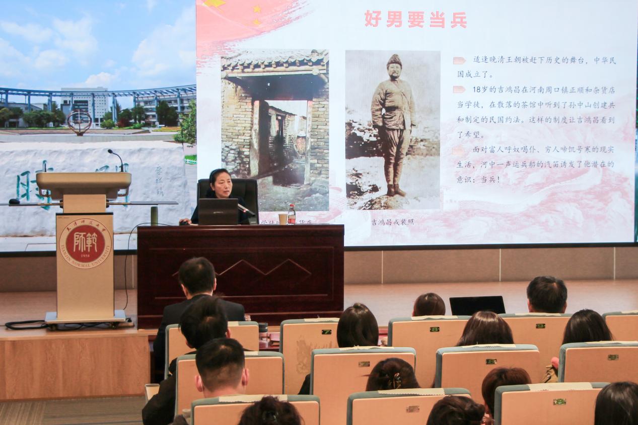 革命先烈吉鸿昌将军的后代郑吉安女士应邀作专题党课报告。郑吉安女士是抗日将领、民族英雄吉鸿昌将军的外孙女。自部队退休后,她长期担任红色宣讲员,深入部队、机关和学校,致力于革命先烈英雄事迹与红色精神的传播。在本次集体党课中,郑吉安女士以吉鸿昌将军不屈不挠的抗战一生为主线,结合鲜活感人的影像资料,从家属视角出发,围绕将军的生平事迹、精神内涵与时代传承三个方面进行系统讲述,生动展现了革命先烈坚定的理想信念和崇高的家国情怀,引发在场师生的强烈共鸣。