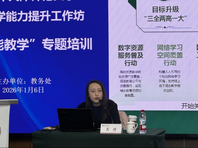在教师教学能力提升工作坊“AI赋能教学”专题培训中,吴丹立足国家教育数字化战略与高等教育改革实践,系统梳理了人工智能推动高等教育深刻变革的时代背景与政策脉络,深入剖析了教育数字化、信息化向数智化、智慧化演进的发展趋势。围绕高校数智教育的实践路径,她结合武汉大学、华中师范大学的实践案例,从人才培养模式重构、课程体系优化、课堂教学形态革新、教育评价转型等方面,阐述了数智技术赋能本科教育教学的系统思路。重点介绍了“AI+专业图谱”在教学过程管理与质量评价中的运用思路,通过构建知识图谱、专业画像与多元数据分析,实现对教学目标达成度的动态监测与教学质量的持续改进,为我校构建更加科学、精准的教育教学评价体系提供了有益借鉴。