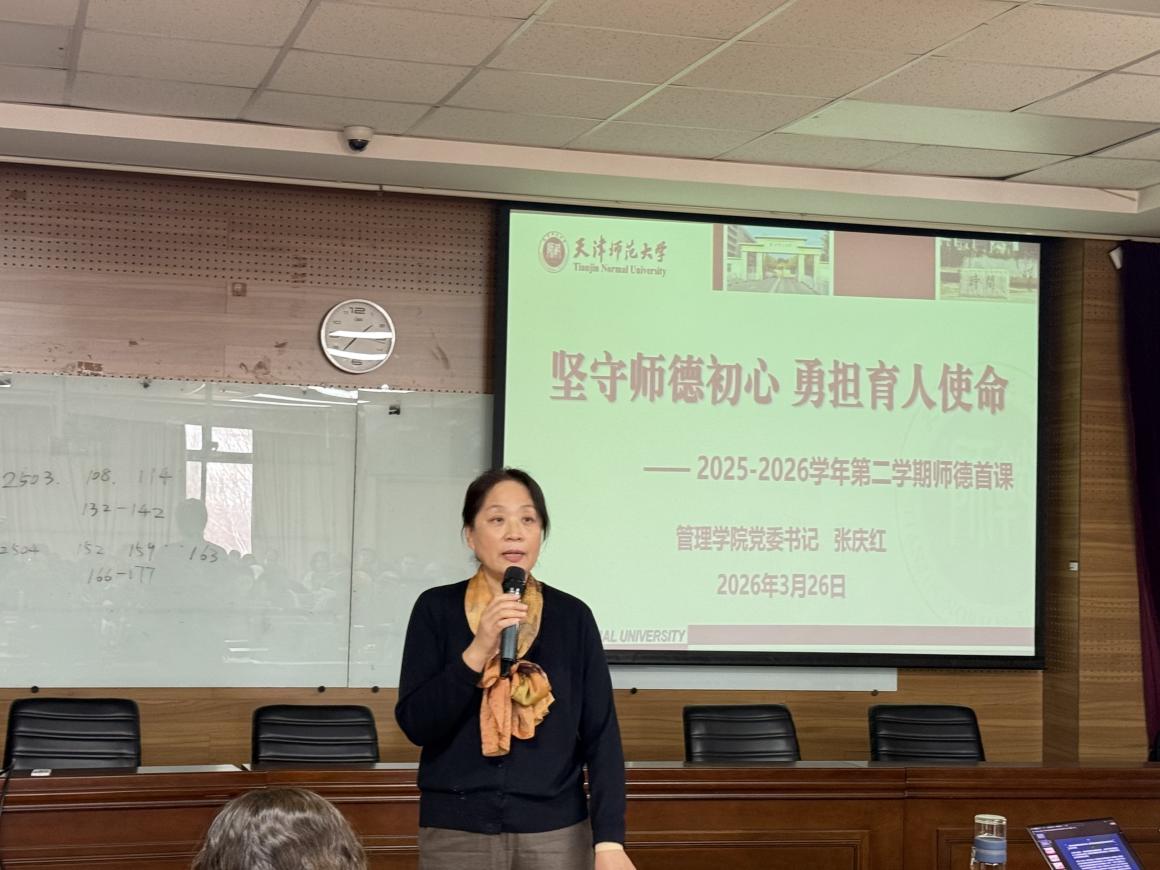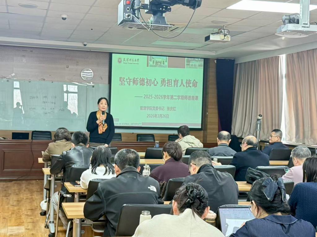 为深入贯彻习近平总书记关于教育的重要论述,大力弘扬教育家精神,切实加强教师队伍建设,2026年3月26日,管理学院召开全体会,院党委书记张庆红为全院教职工讲授“师德首课”,凝聚育人共识,筑牢师德防线。