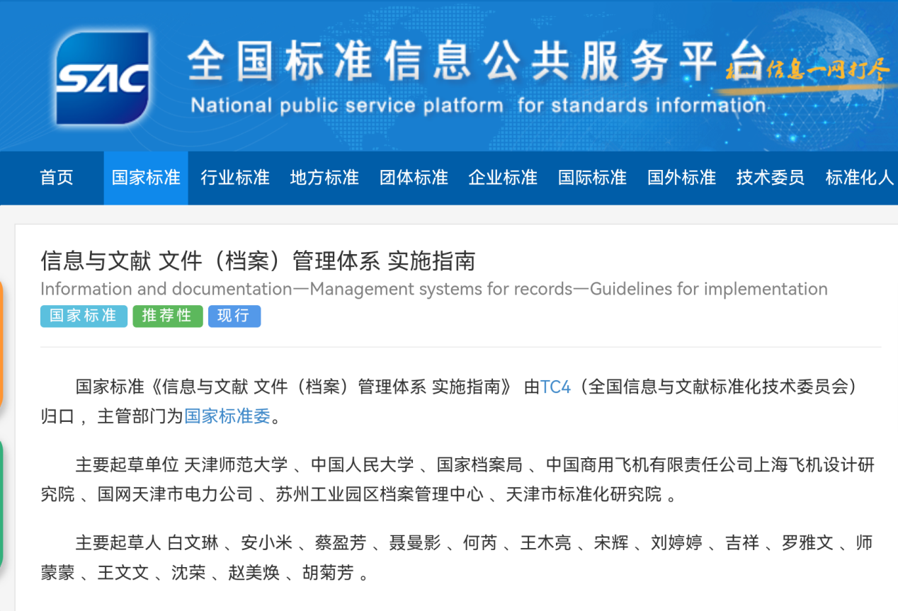 2025年8月,由我院白文琳副教授牵头起草的国家标准《信息与文献 文件(档案)管理体系 实施指南》(GB/T 41207—2025)正式发布,并于2026年2月1日起实施。该标准修改采用国际标准ISO 30302:2022《信息与文献 文件管理体系 实施指南》,同步替代旧版 GB/T 41207—2021。